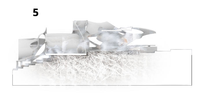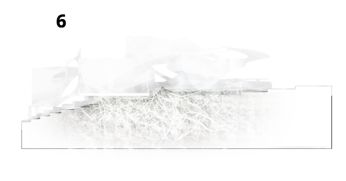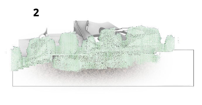 To minimize excessive subjective human intervention, I have based my study on the properties of mycelium. I used a computer and Grasshopper to simulate the growth of mycelium across my site. There are five designated compost piles on the map, which serve as "food points." Mycelium emerges from these points, connecting them and facilitating nutrient sharing.